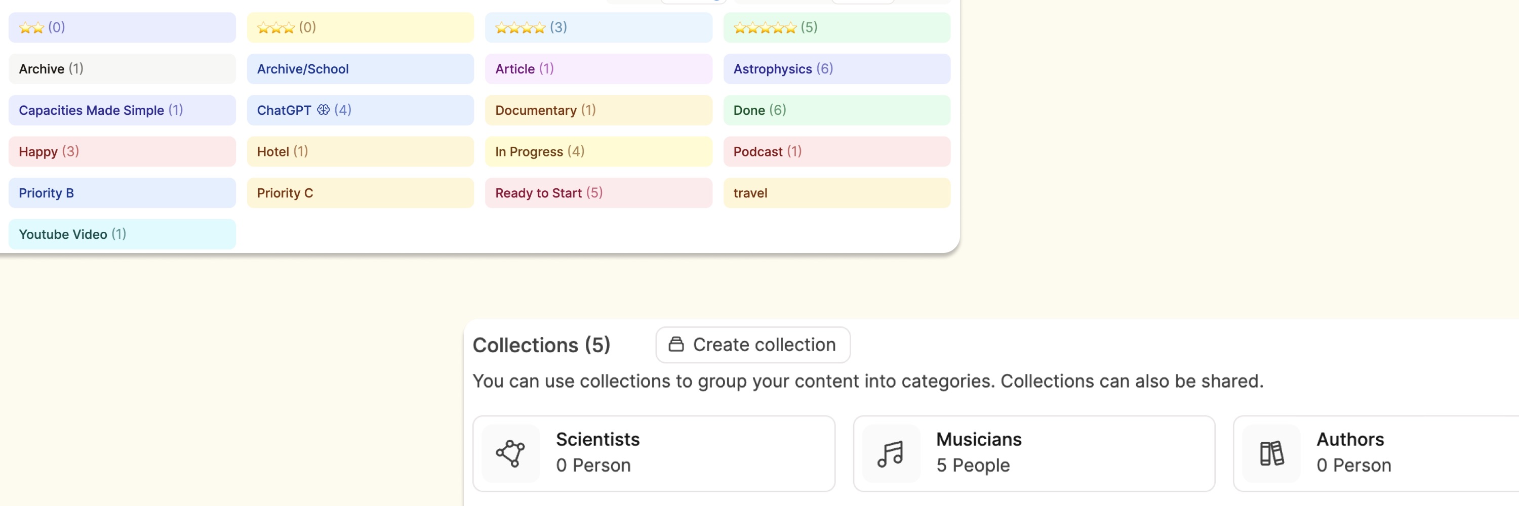 Based on the examples above, I would have a status collection, a rating collection and then leave ChatGPT out of a collection for now. As more tags emerge, I might need a ‘tech’ or ‘AI’ collection.